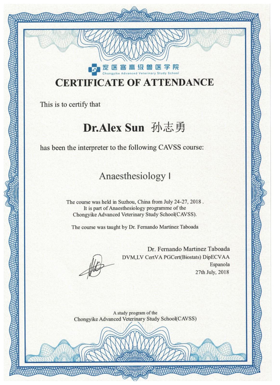 宠医客麻醉科证书