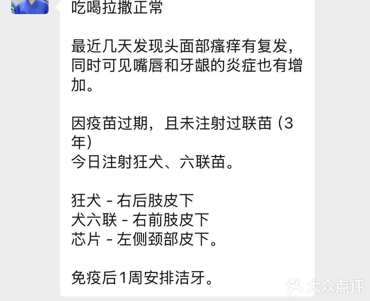 诊疗水平:家里小狗皮肤瘙痒反反复复,已经不知道这是去的第几家医院了🏥医生非常专业,给出了不同角度的分析和建议,给出了几个不同的方案分析利弊,引导我们怎么去做和观察。